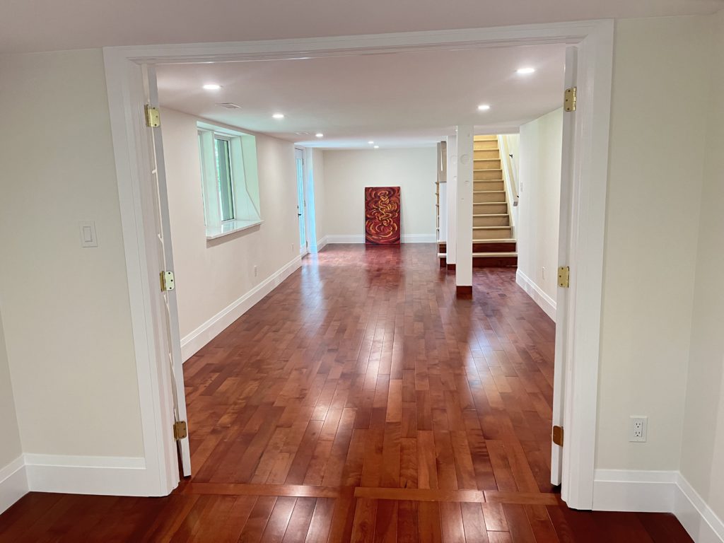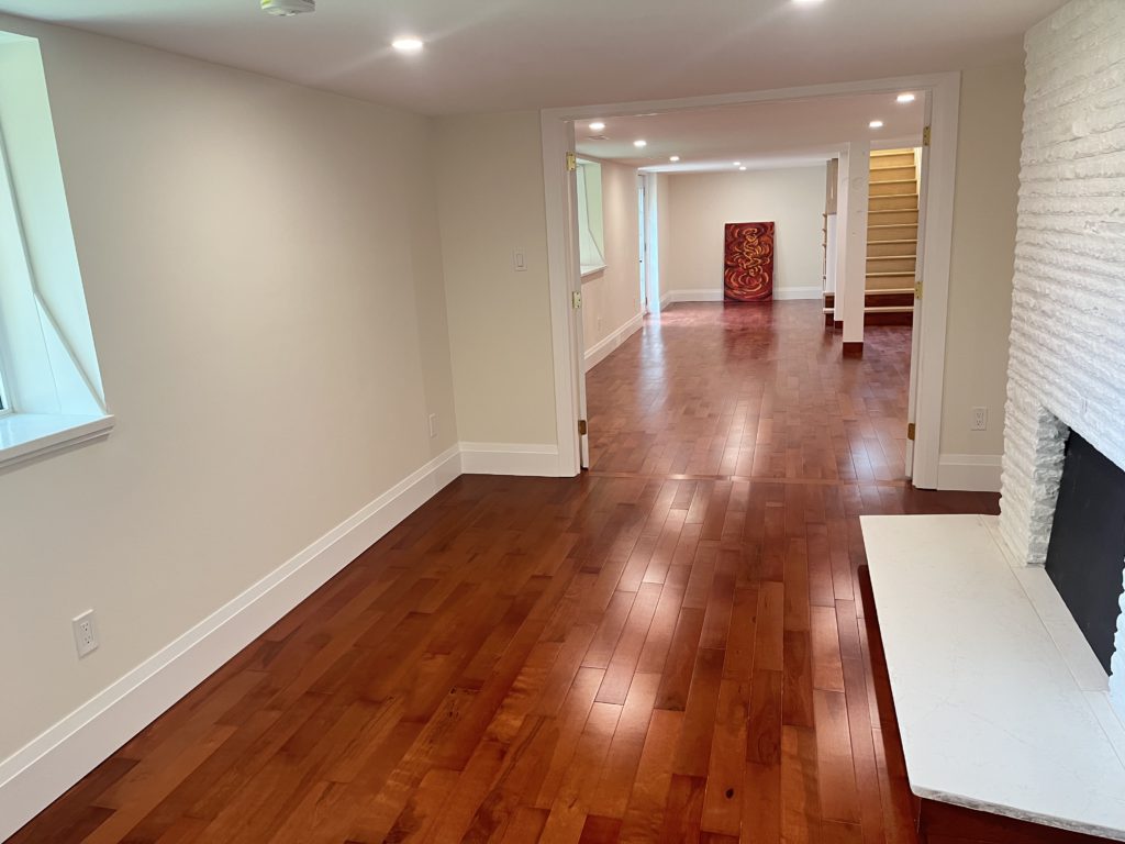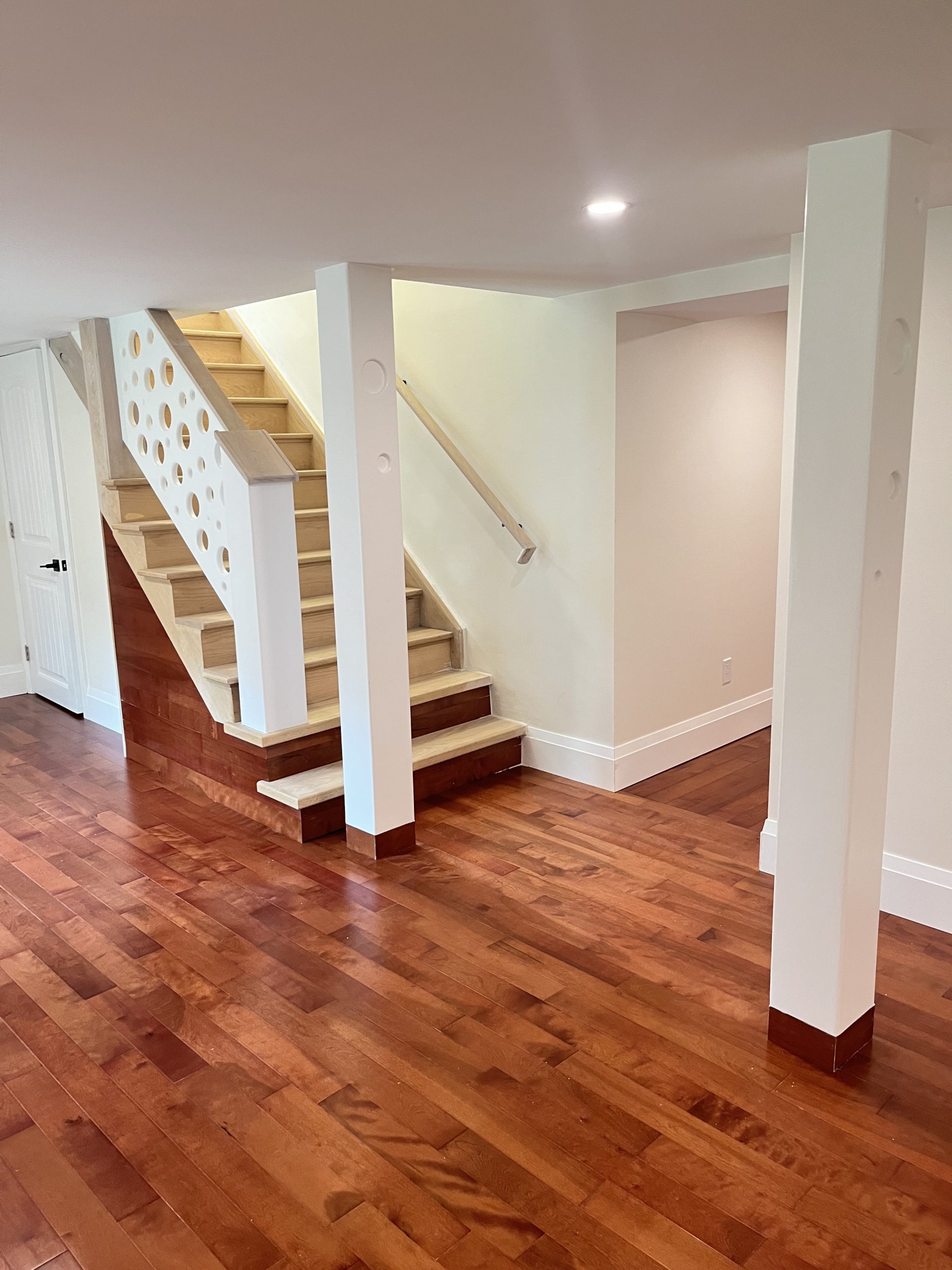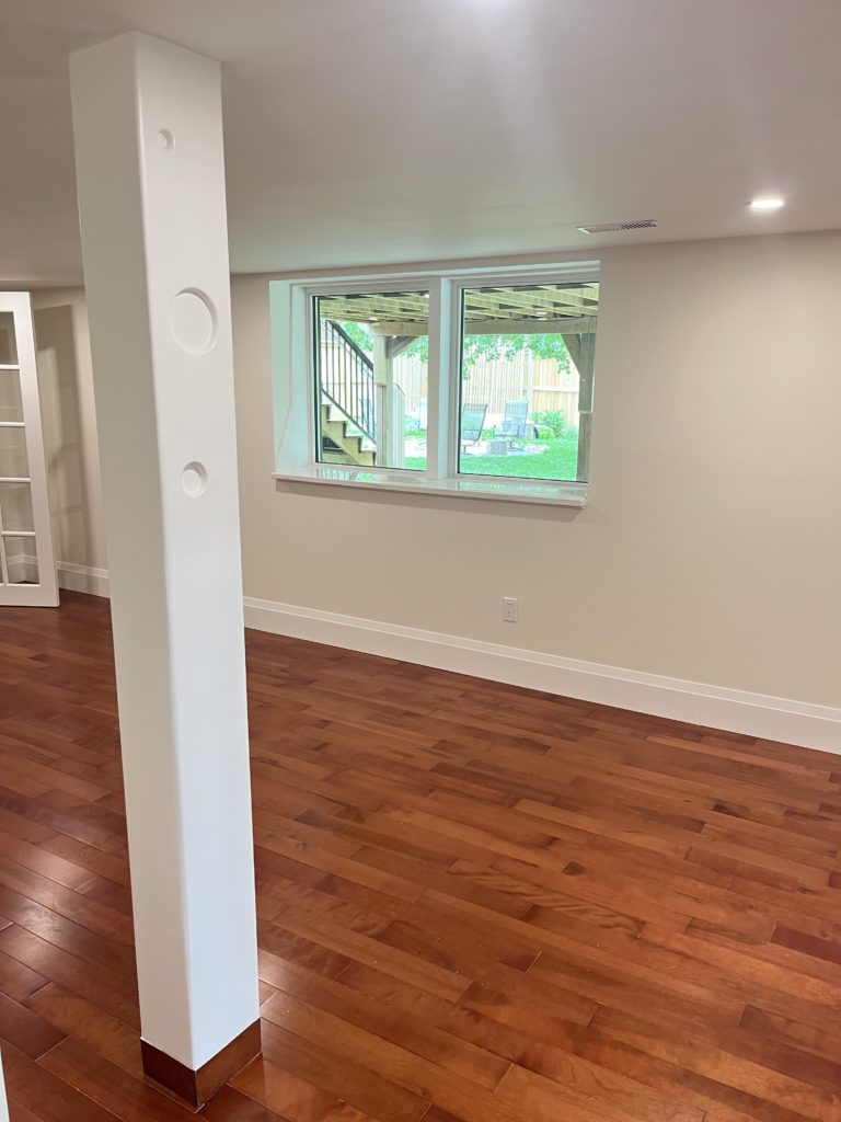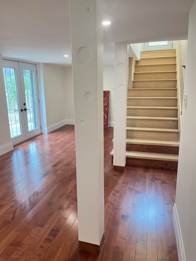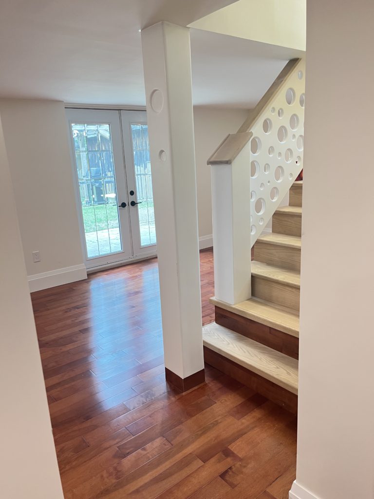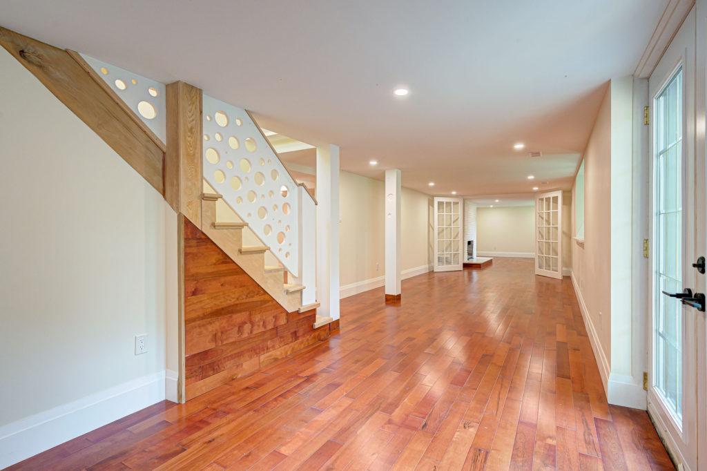 This home needed a fresh start from bottom to top we replaced almost everything. The basement received a custom built banister and an Oak staircase. The honey cherry engineered hardwood flooring floating above a newly insulated sub floor brings warmth to this new space. The french doors provide the opportunity to separate the room into 2 creating an additional space. Over sized base boards and quartz window sills make this space elegant and comfortable.