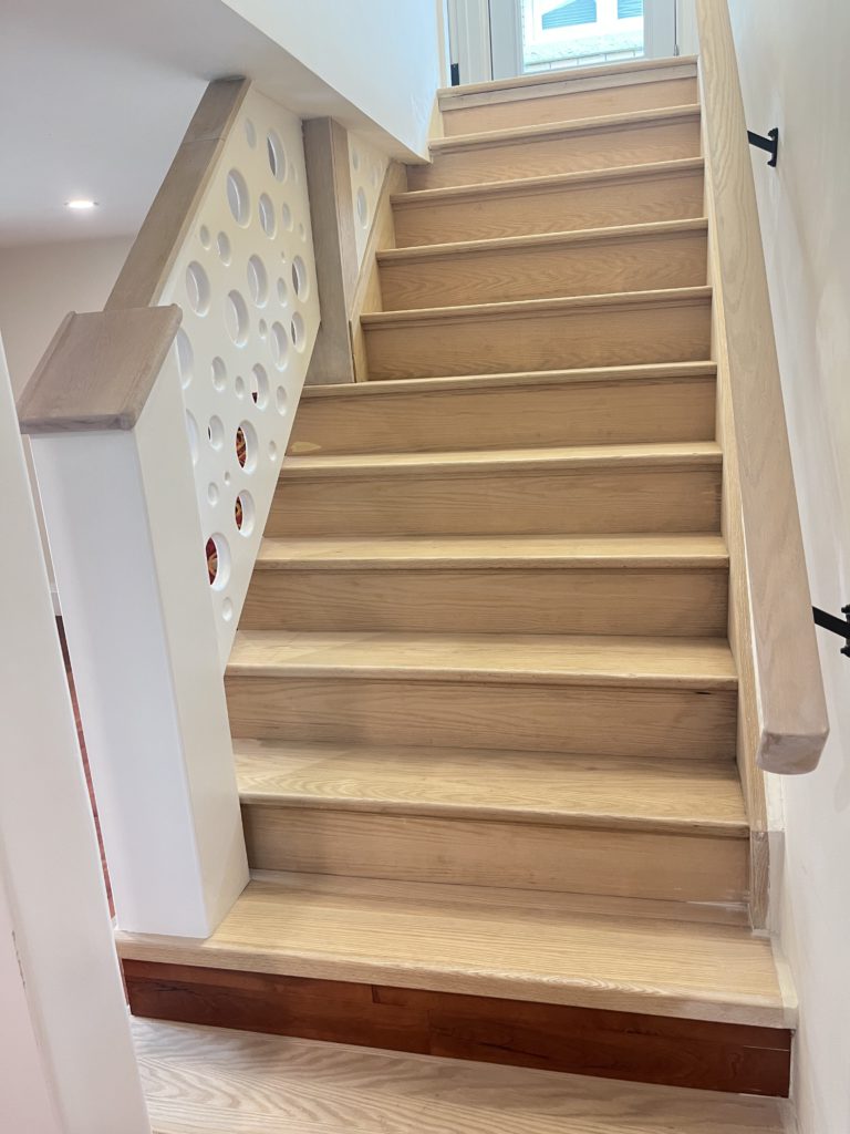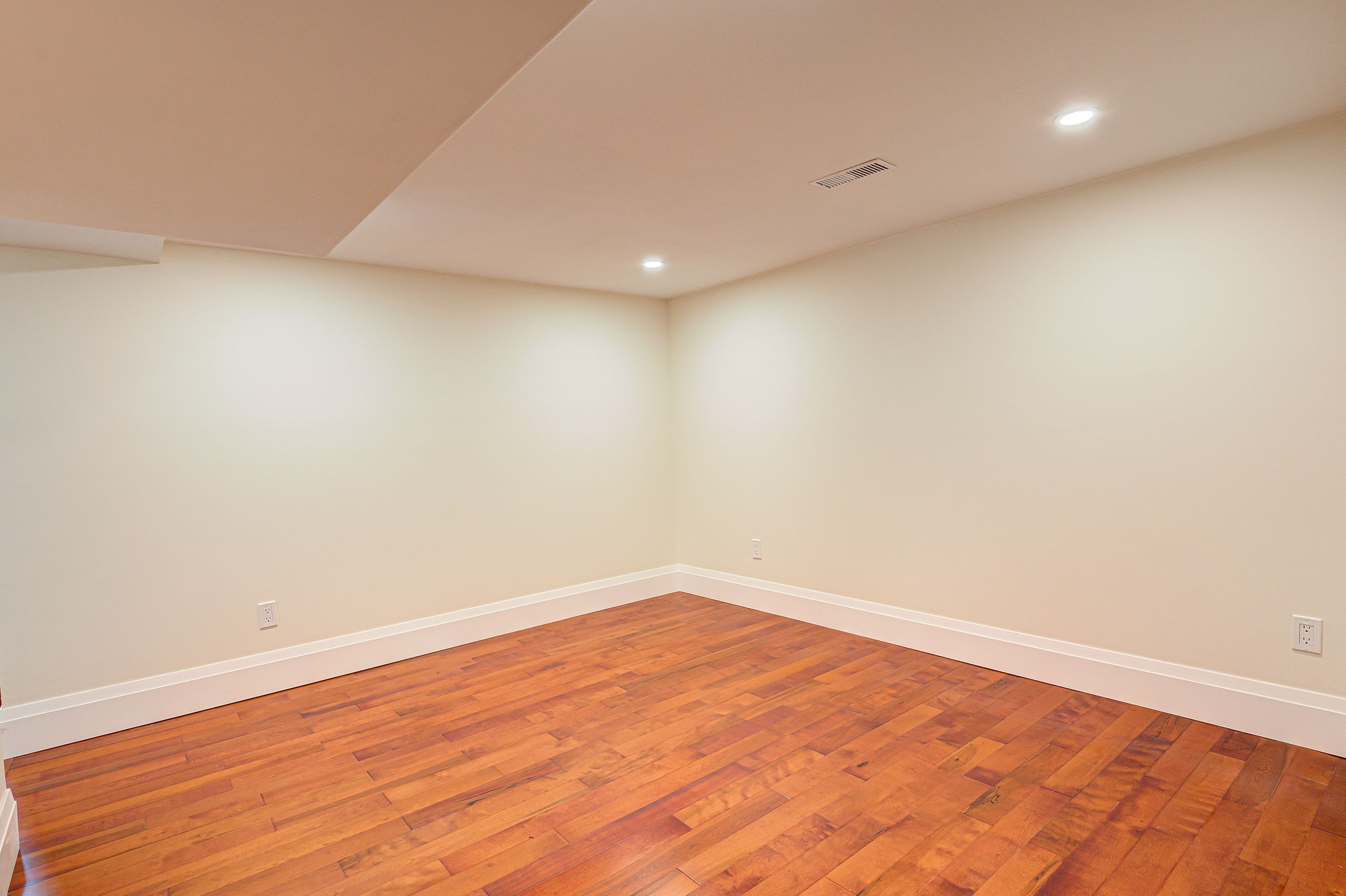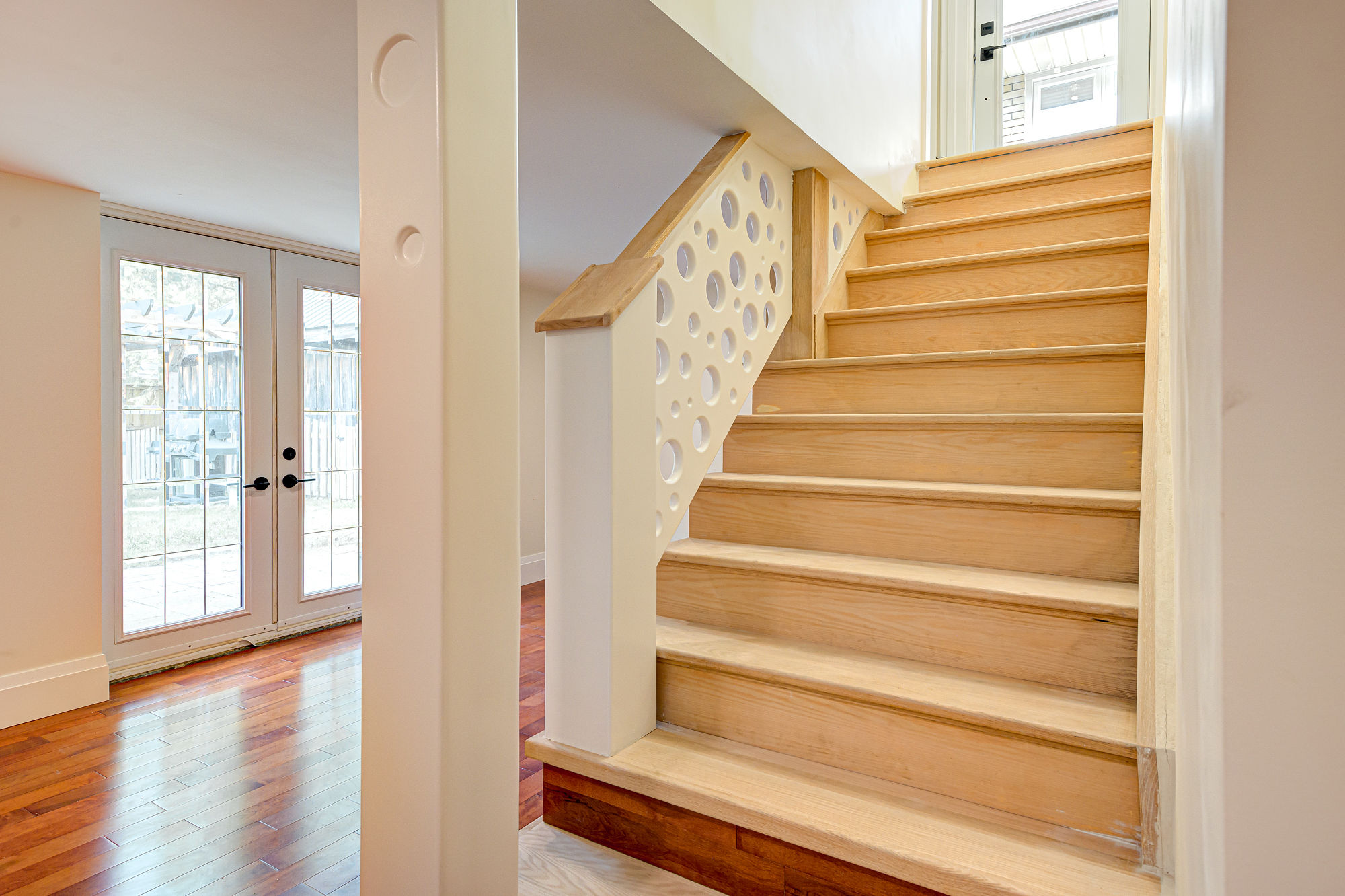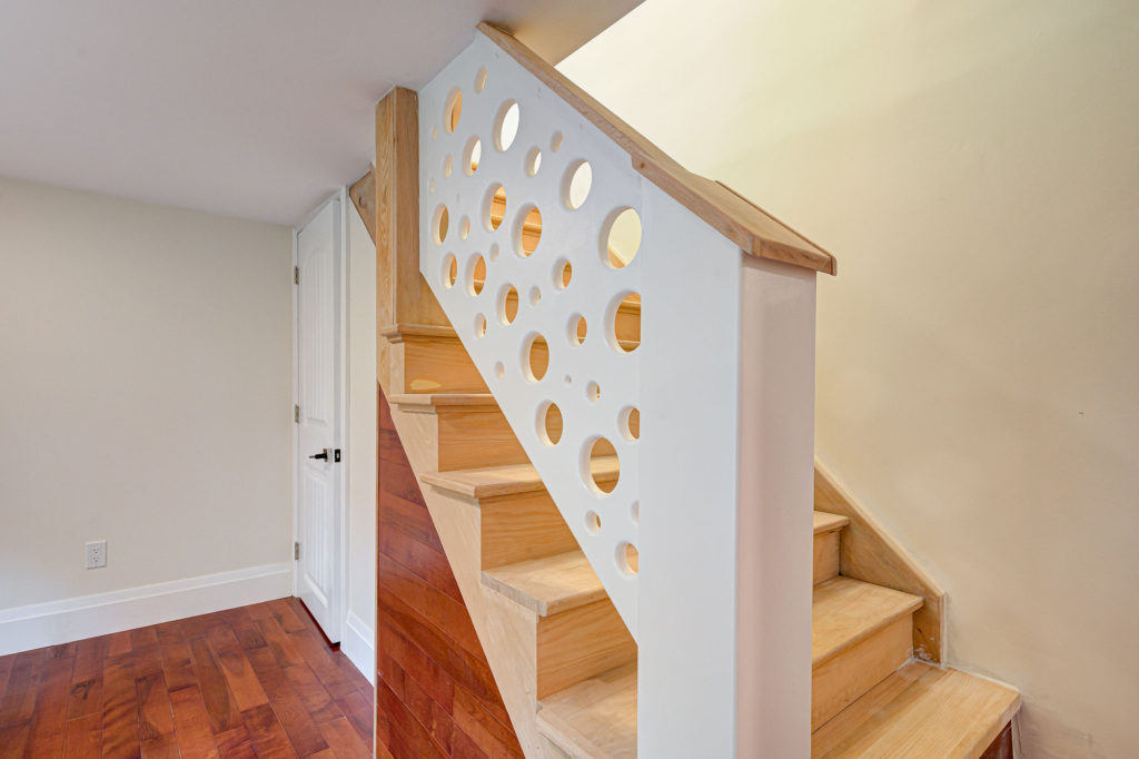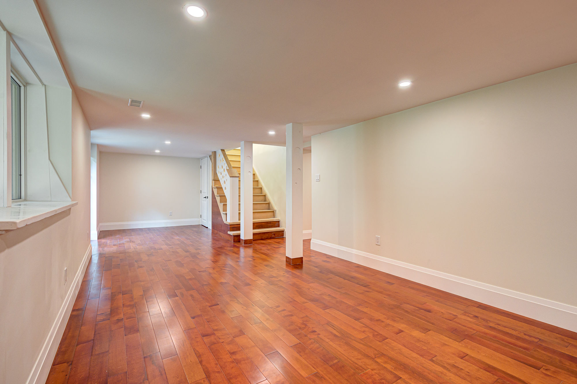 This home needed a fresh start from bottom to top we replaced almost everything. The basement received a custom built banister and an Oak staircase. The honey cherry engineered hardwood flooring floating above a newly insulated sub floor brings warmth to this new space. The french doors provide the opportunity to separate the room into 2 creating an additional space. Over sized base boards and quartz window sills make this space elegant and comfortable.