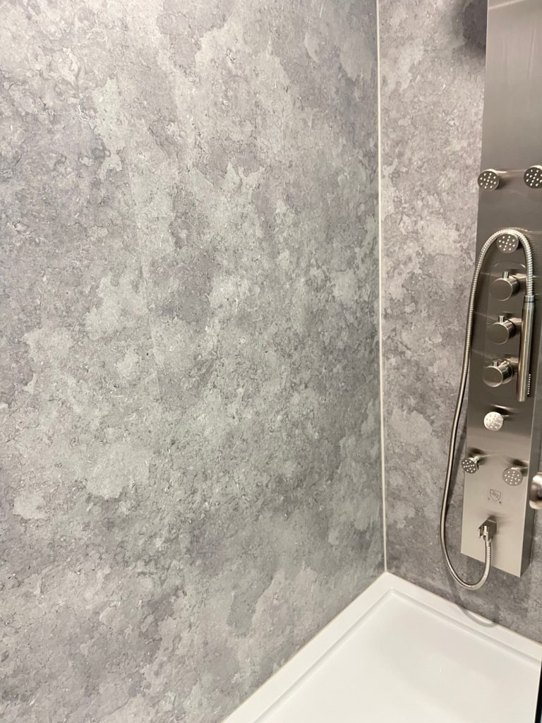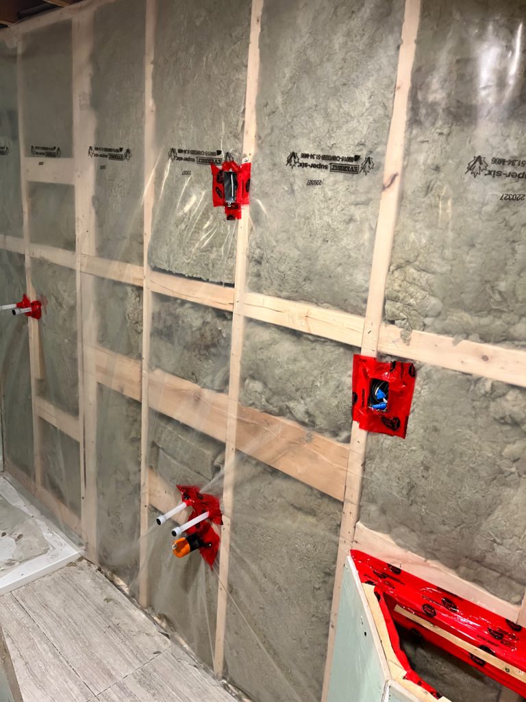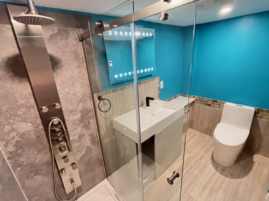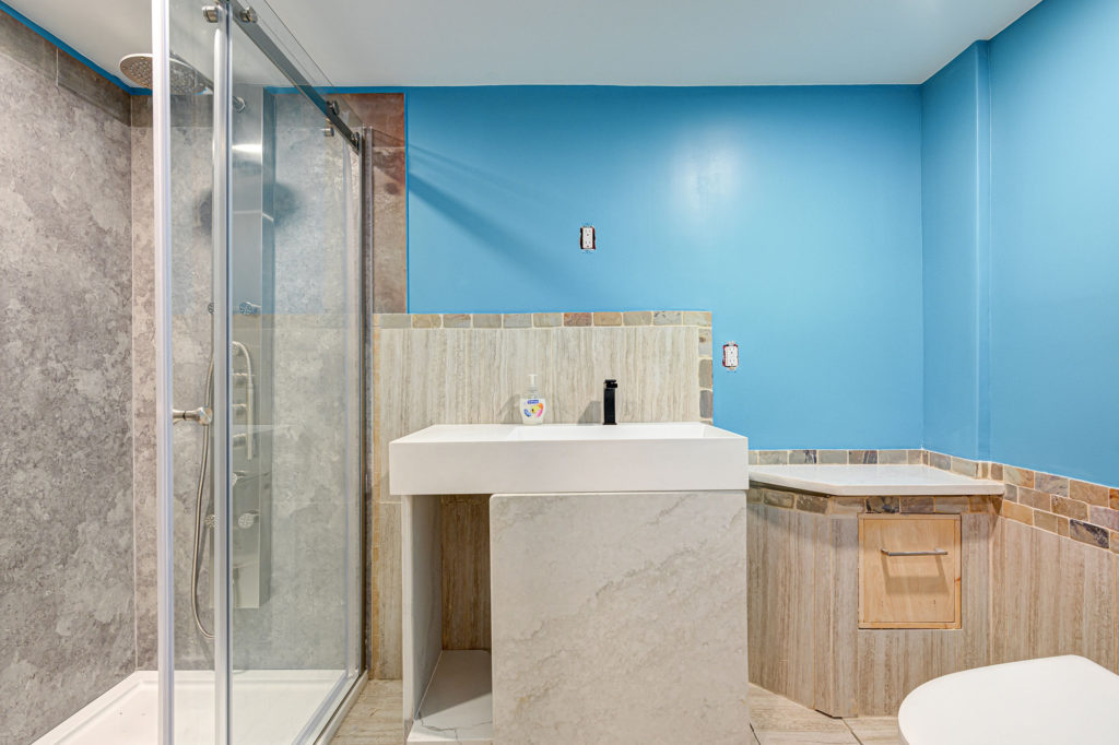 A custom vanity and Walk-in shower compliments the in-floor heating in this basement bathroom. Categories: Bathrooms