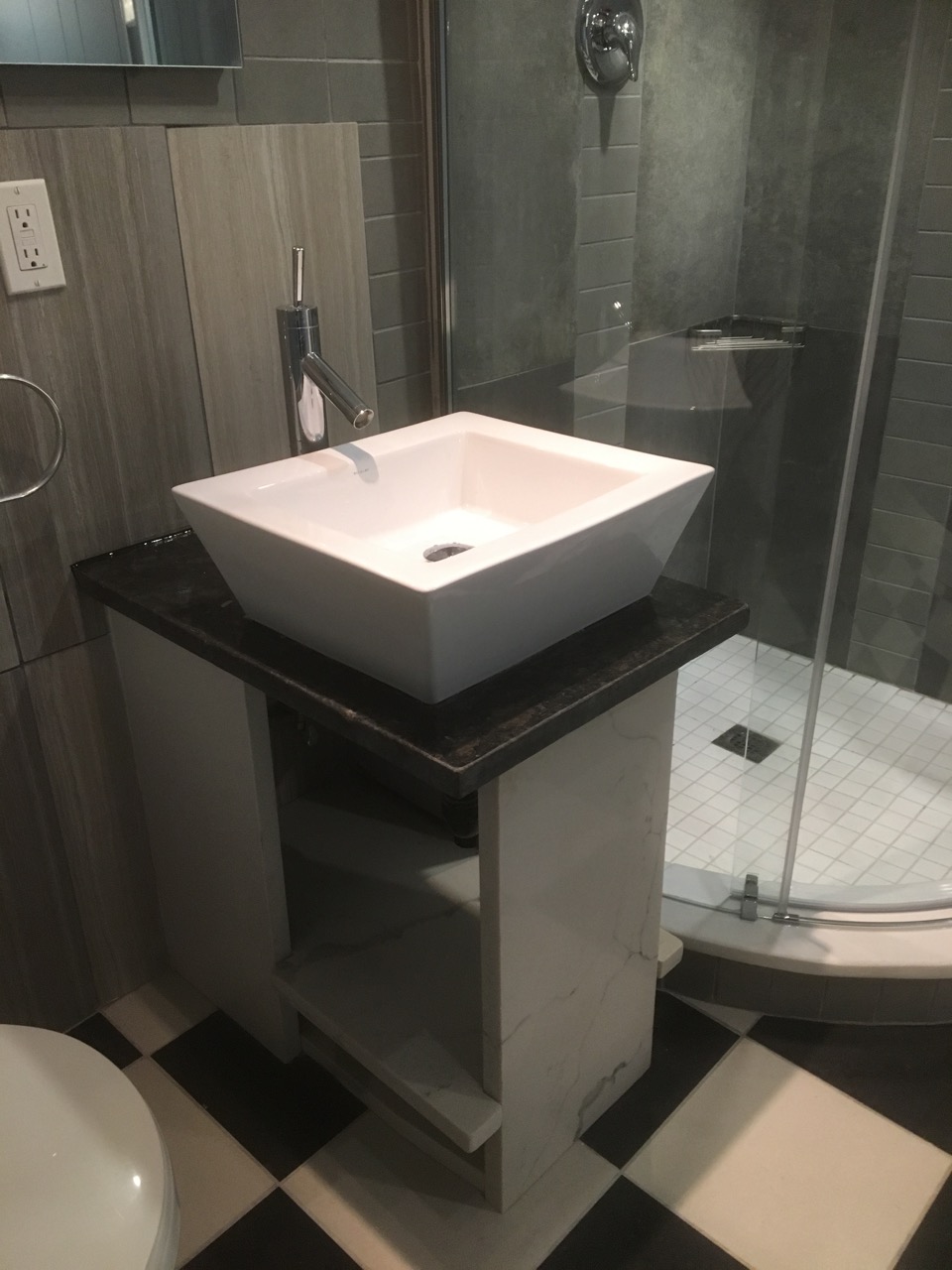 This bathroom has a custom curved corner shower and a custom stone vanity.