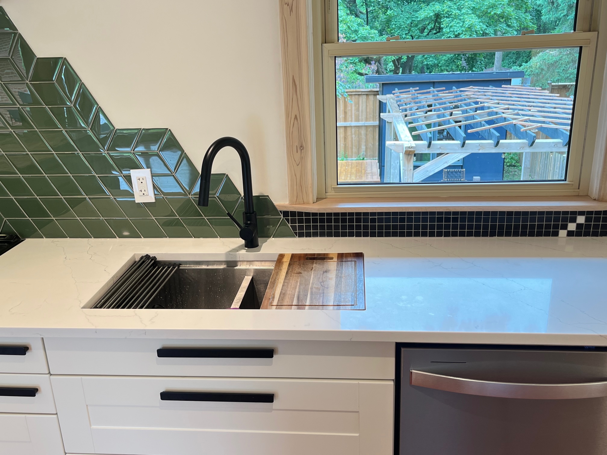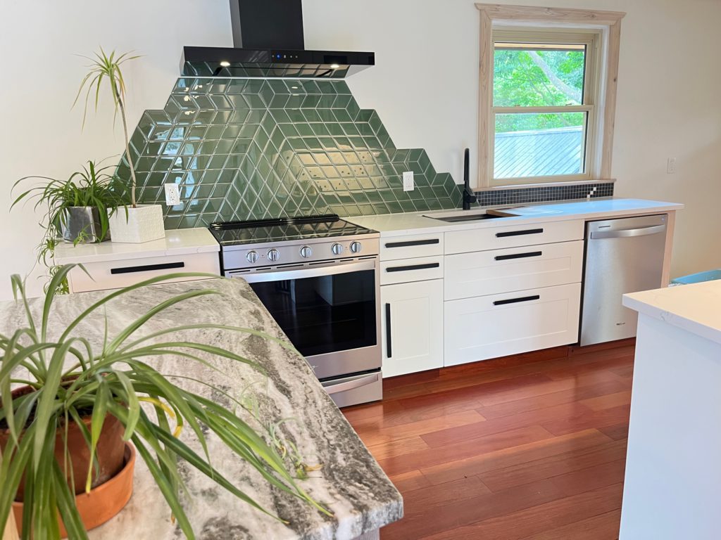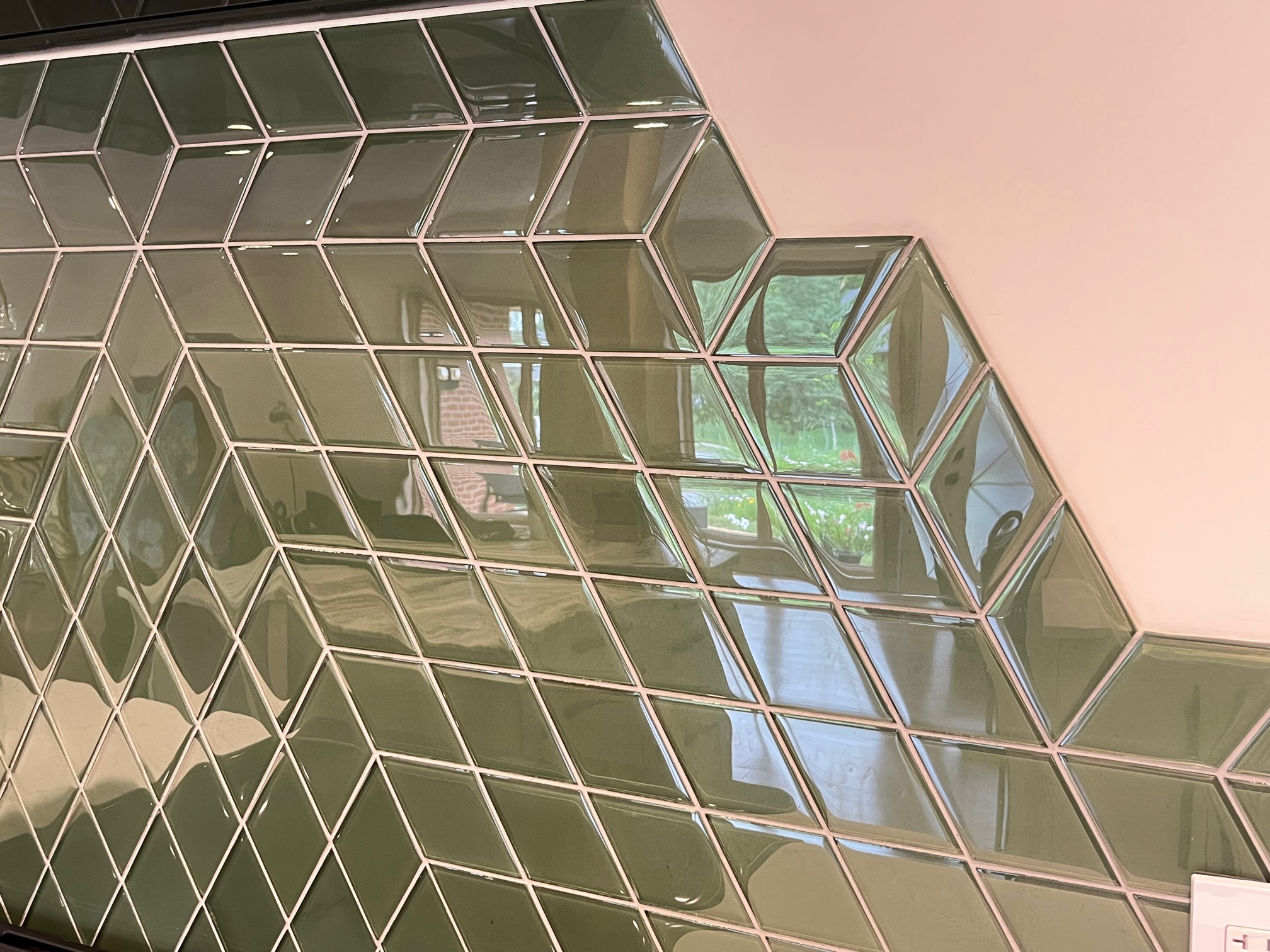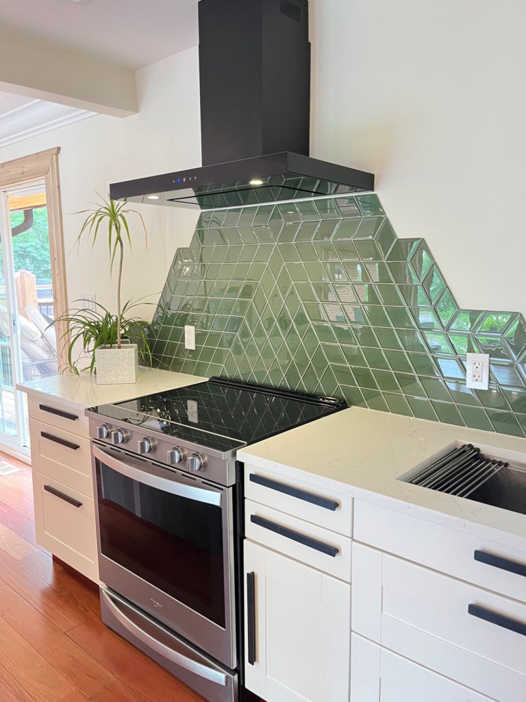 This unique kitchen design was created with the influence of Mayan design. The emerald green glass tiles were laid out to create the pattern of a stepped pyramid. Categories: Kitchens