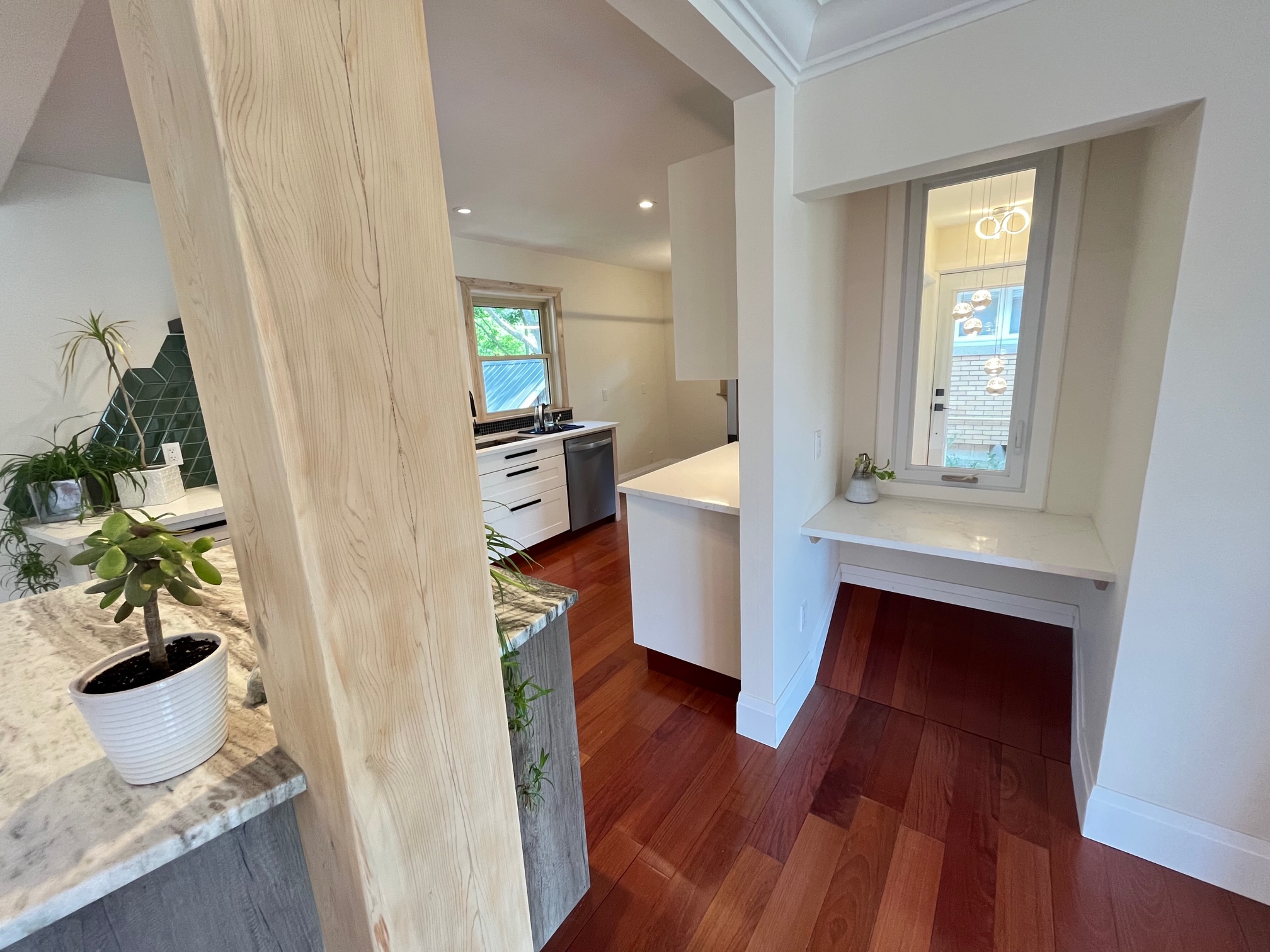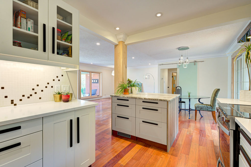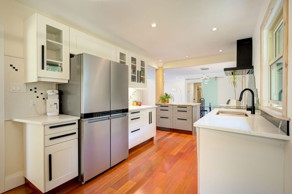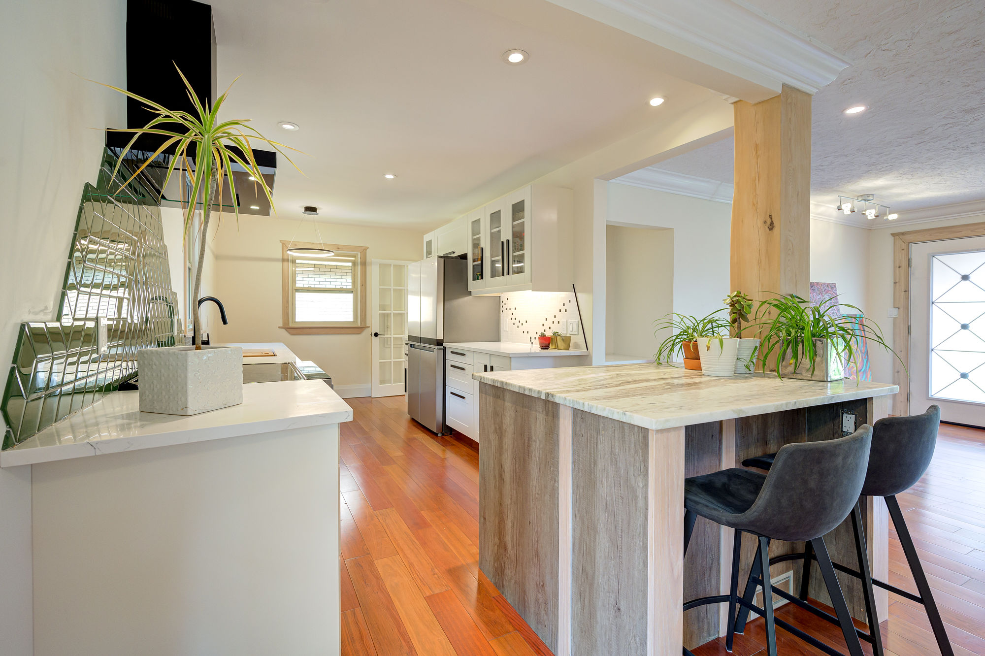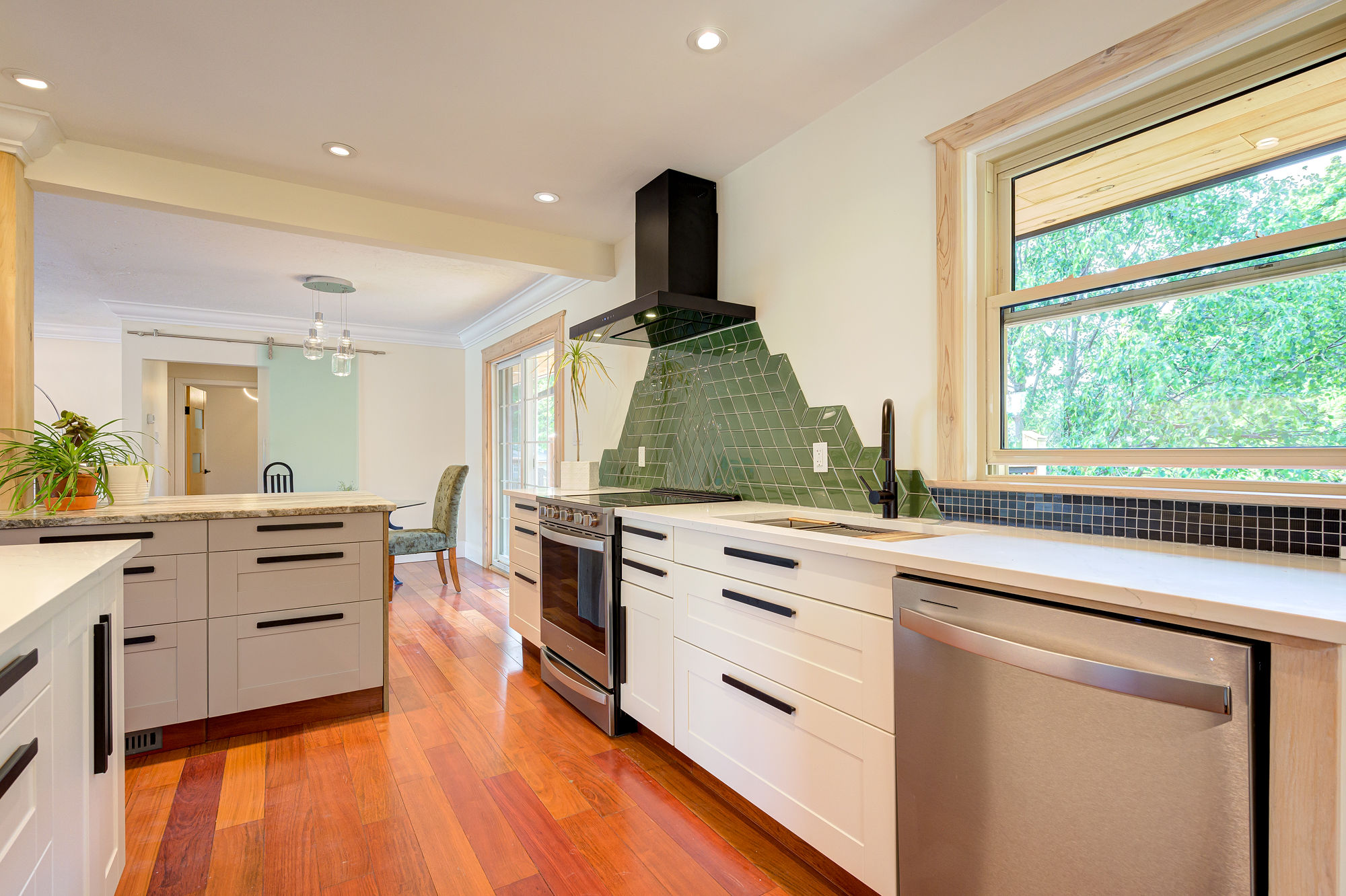 This unique kitchen design was created with the influence of Mayan design. The emerald green glass tiles were laid out to create the pattern of a stepped pyramid. Categories: Kitchens