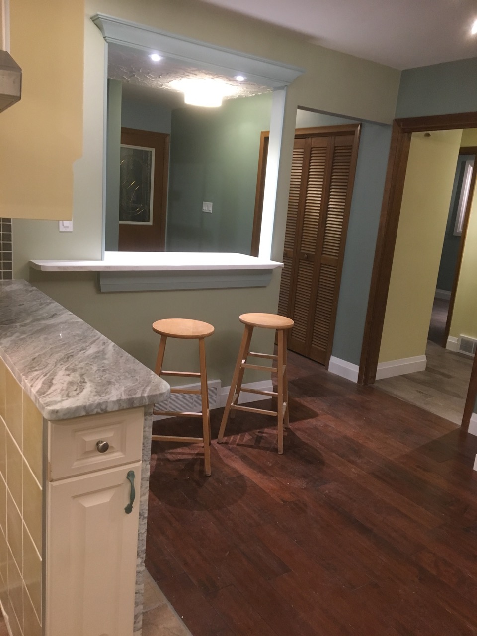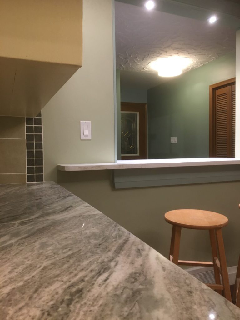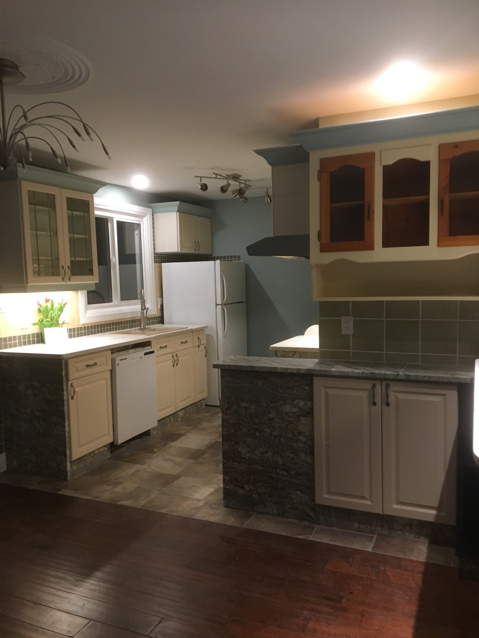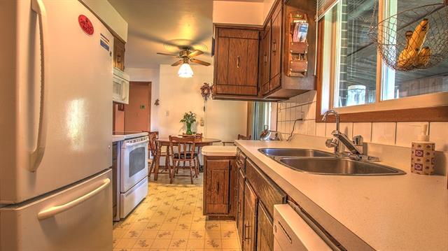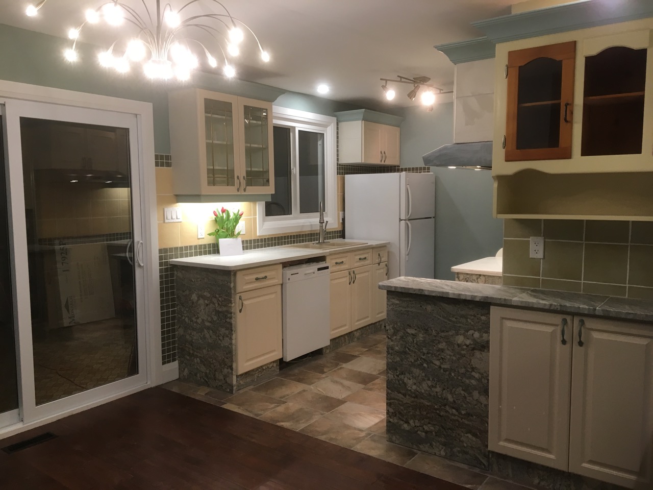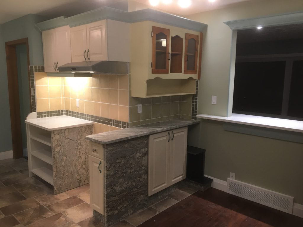 This home had a complete renovation, the new kitchen with a sit in dining area had new flooring, cupboards, counters, tiling, lighting and paint. The quartz end plates on the cupboards make this a unique space.
